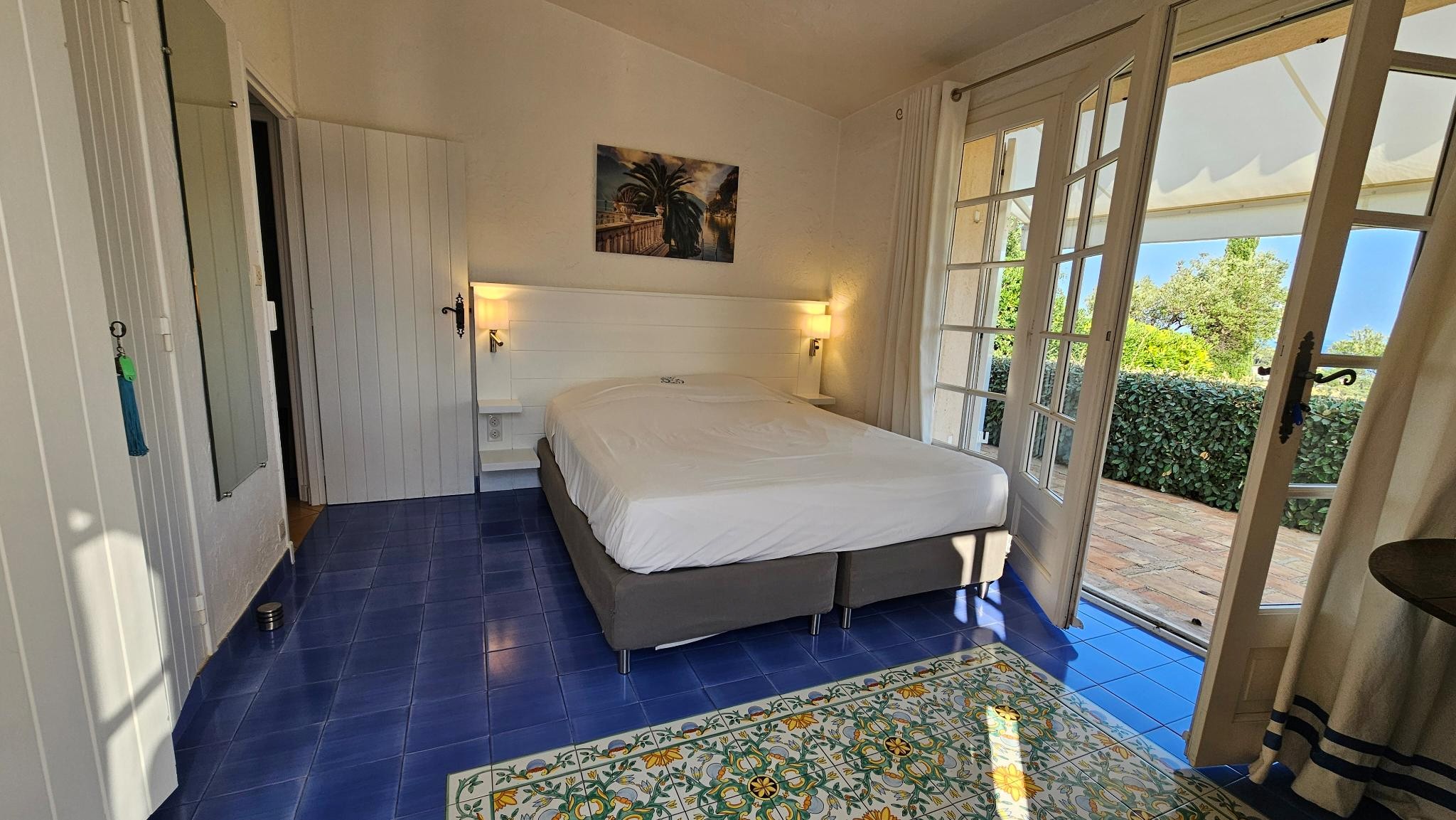 The living room faces the terrace with a view of the garden and the gulf.